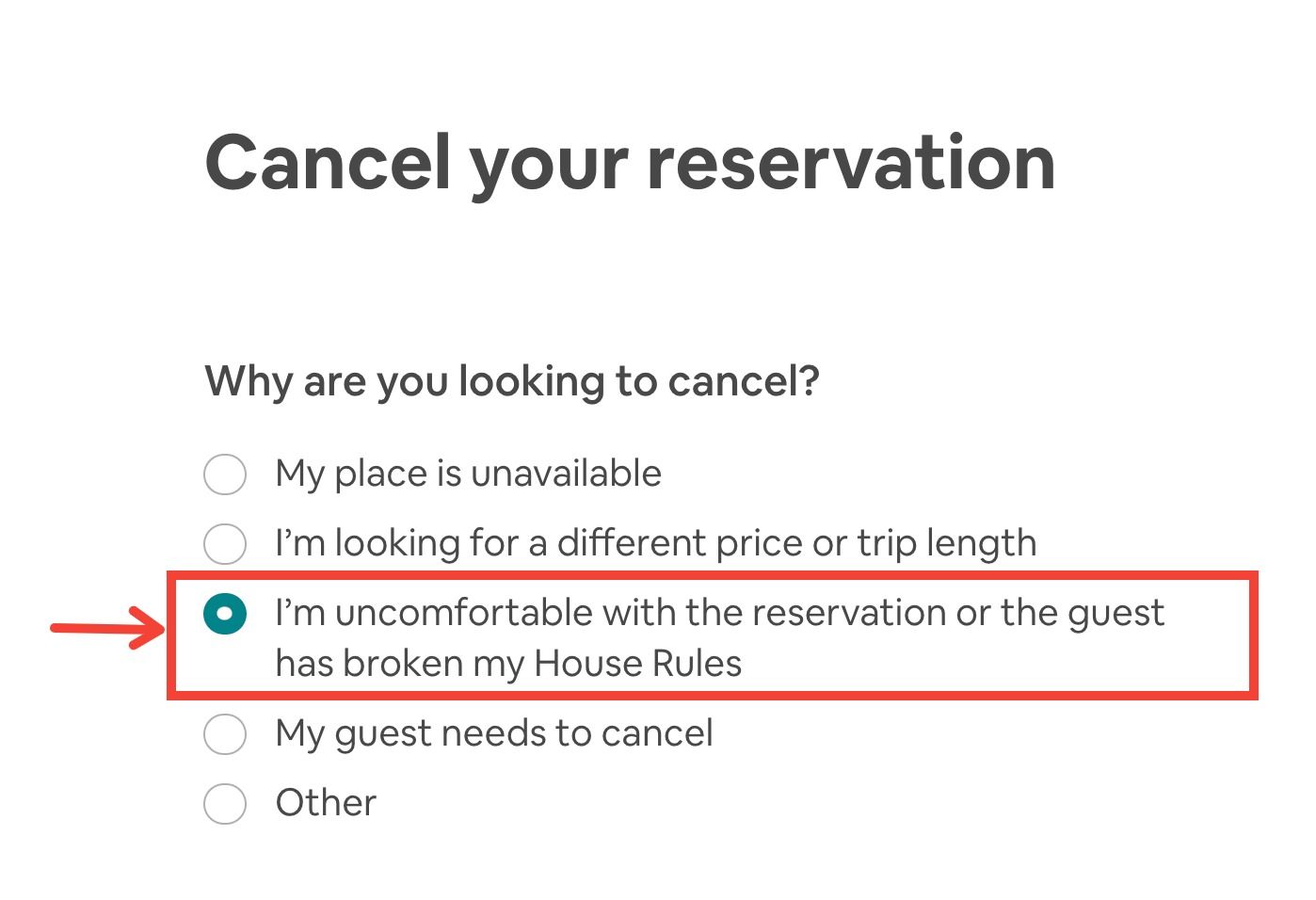 - IMPORTANT ⚠️ — select the reason "I’m uncomfortable with the reservation or the guest has broken my House Rules" > click Next (see the picture below)