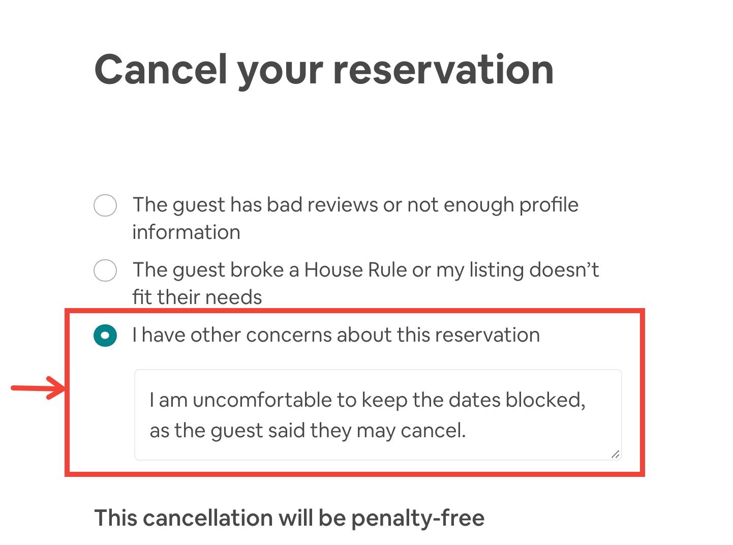 - On the next screen if the guest has no negative reviews or broke your house rules — tick "I have other concerns about this reservation" > type a short description why you're canceling (it won't be shown to your guest) > click Next