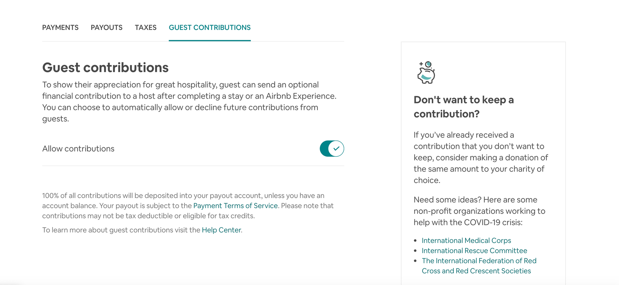 To show appreciation, eligible guests (those who stayed within past 60 days) can send a financial contribution to hosts they’ve given 5-star ratings. Airbnb does not charge service fee for financial contribution, hosts will receive 100% of this payment. If a guest sends a financial contribution, it will be sent to the same payout method as the reservation.