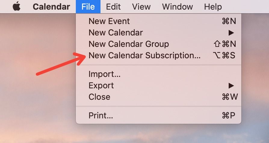 3. On your MacBook open Calendar app 📅 > click File > New Calendar Subscription